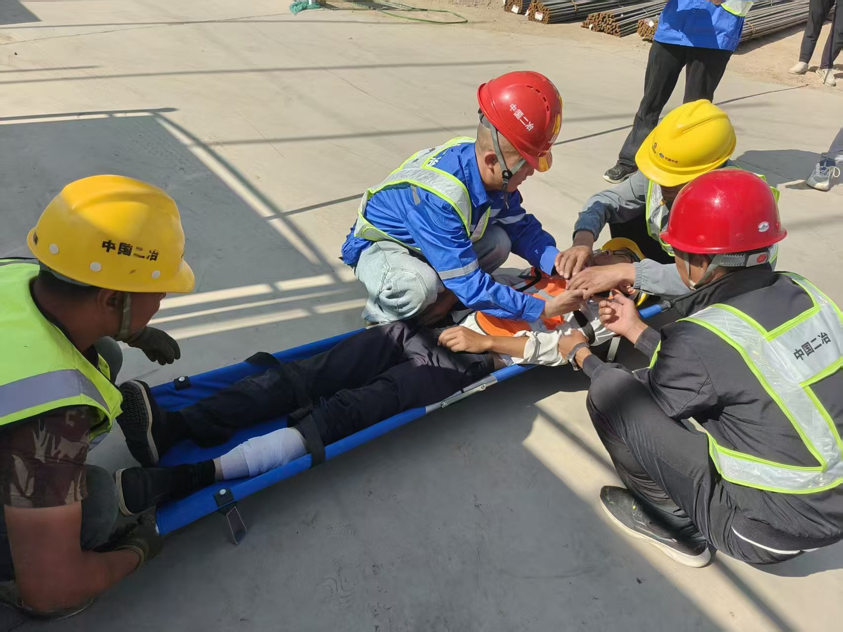本次演練通過模擬真實場景,演練前安全員對整個流程進(jìn)行敘述,明確各人員職責(zé)。通過模擬鋼筋工在使用鋼筋機具時,作業(yè)人員被鋼筋切斷機傷到腿部,班組長發(fā)現(xiàn)情況后立即向上報告,項目部即刻啟動應(yīng)急預(yù)案,第一時間查看傷員情況,對傷員腿部做消毒、包扎處理,隨即抬上擔(dān)架,送往最近的救援醫(yī)院。整個演練過程井然有序,達(dá)到了演練預(yù)期的目的。