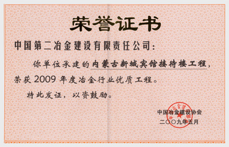 內(nèi)蒙古新城賓館接待樓獲冶金行業(yè)優(yōu)質(zhì)工程、中冶集團優(yōu)質(zhì)工程、內(nèi)蒙古自治區(qū)優(yōu)質(zhì)樣板工程、內(nèi)蒙古自治區(qū)用戶滿意工程。