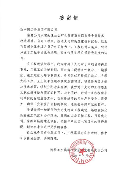 阿拉善左旗珠拉黃金開發(fā)有限責任公司在感謝信中指出,在工期緊、任務(wù)重的情況下,項目部在跟進進度的同時,嚴把安全質(zhì)量關(guān),確保了安全生產(chǎn)目標的實現(xiàn),是所有參建單位中的標桿。