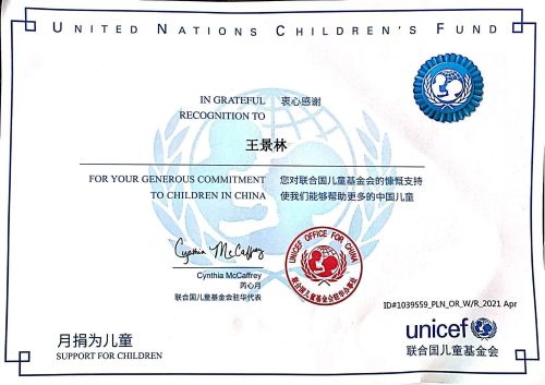 6月9日,聯(lián)合國兒童基金會(huì)致謝中國二冶優(yōu)秀青年員工王景林,對其多年來堅(jiān)持向聯(lián)合國兒童基金會(huì)捐款表示衷心感謝。