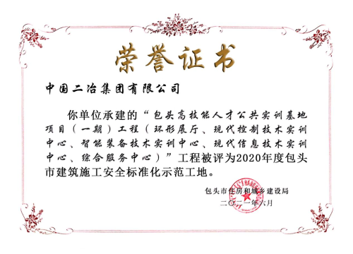 實(shí)訓(xùn)基地項(xiàng)目先后獲評(píng)中冶安全文明標(biāo)準(zhǔn)化工地、內(nèi)蒙古綠色建筑工地、“中施企協(xié)綠色建造評(píng)價(jià)”二星等多個(gè)安全文明類獎(jiǎng)項(xiàng),同時(shí)在2020年7月份組織的中國(guó)二冶集團(tuán)內(nèi)蒙古自治區(qū)片區(qū)“安全文明標(biāo)準(zhǔn)化”觀摩活動(dòng)中獲得當(dāng)?shù)卣c集團(tuán)公司的一致好評(píng)。