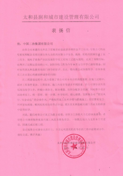 9月1日,中國二冶安徽太和衛(wèi)星城基礎(chǔ)設(shè)施建設(shè)項目部收到太和縣潤和城市建設(shè)管理有限公司發(fā)來表揚信,同時向中國二冶各級領(lǐng)導(dǎo)、全體參戰(zhàn)員工表示衷心的感謝和誠摯的問候。