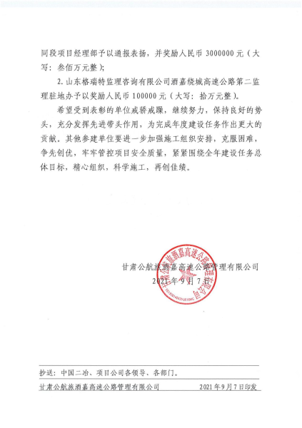 9月7日,甘肅公航旅酒嘉高速公路管理有限公司公發(fā)出通報,對在安全、質量、進度、廉政等方面取得優(yōu)異成績的施工單位進行表彰,中國二冶酒嘉項目部榮登榜首,獲得獎金300萬元。