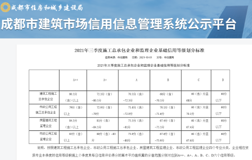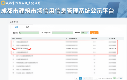 10月8日,成都市建筑市場(chǎng)信用信息管理系統(tǒng)公示平臺(tái)數(shù)據(jù)顯示,中國(guó)二冶在成都地區(qū)信用等級(jí)二、三季度蟬聯(lián)A++。進(jìn)一步樹立起了中國(guó)二冶在蜀良好的誠(chéng)信品牌形象。