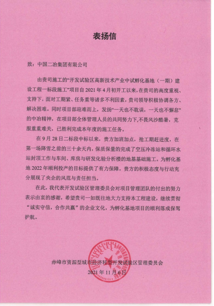 信中寫(xiě)到,自項(xiàng)目開(kāi)工以來(lái),中國(guó)二冶集團(tuán)予以高度重視,在工期緊、任務(wù)重等諸多不利環(huán)境下,項(xiàng)目全體管理人員充分發(fā)揚(yáng)“一天也不耽誤,一天也不懈怠”的企業(yè)精神,克服重重困難,按照項(xiàng)目施工節(jié)點(diǎn)順利完成本年度施工任務(wù)。