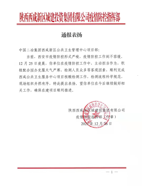 表揚信中說到,當前西安市疫情防控形勢嚴峻,疫情防控工作刻不容緩。12月25日凌晨,中國二冶西咸新區(qū)公共衛(wèi)生管理中心項目部在疫情防控工作中,主動擔當作為,積極配合園辦克服天氣嚴寒、檢測人員眾多等客觀因素,順利完成西咸公共衛(wèi)生服務中心項目核酸檢測工作,檢測流程科學規(guī)范,現(xiàn)場組織井然有序。信中還說,希望西咸新區(qū)公共衛(wèi)生管理中心項目部在今后繼續(xù)做好相關工作,確保在建項目順利推進。