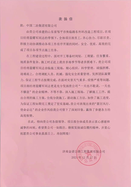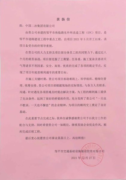 12月27日,山東鄒平市交通基礎(chǔ)設(shè)施建設(shè)投資有限公司、濟(jì)南金諾公路工程監(jiān)理有限公司致中國(guó)二冶表?yè)P(yáng)信。信中稱贊中國(guó)二冶在施工關(guān)鍵時(shí)期科學(xué)組織、統(tǒng)籌安排、迎難而上、精細(xì)化管理,特此向中國(guó)二冶集團(tuán)各級(jí)領(lǐng)導(dǎo)及全體參戰(zhàn)員工表示由衷的感謝和誠(chéng)摯的問候。