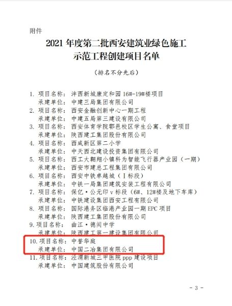 12月30日,由中國二冶承建的中譽(yù)華庭項(xiàng)目榮獲“2021年度第二批西安建筑業(yè)綠色施工示范工程”稱號。
