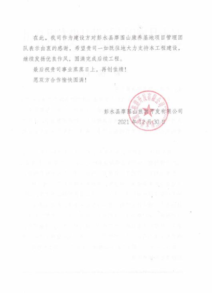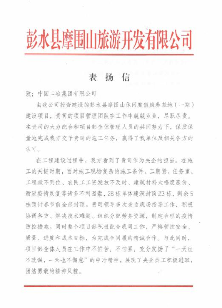 1月4日,中國二冶內(nèi)蒙古分公司項目經(jīng)理部收到項目建設(shè)方彭水縣摩圍山旅游開發(fā)有限公司表揚信,信中對中國二冶集團內(nèi)蒙古分公司在項目建設(shè)中履行央企責任、彰顯央企實力與擔當給予高度贊譽。