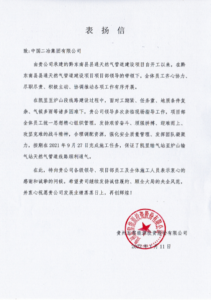 貴州東黎投資股份有限公司在表揚(yáng)信中指出,在凱里至爐山段線路建設(shè)過程中,面對(duì)工期緊、任務(wù)重、地質(zhì)條件復(fù)雜、氣候多雨等諸多困難下,中國二冶領(lǐng)導(dǎo)多次親臨現(xiàn)場指導(dǎo)工作,項(xiàng)目部全體員工統(tǒng)一思想精細(xì)組織管理,合理調(diào)配資源,強(qiáng)化安全質(zhì)量管理、發(fā)揮團(tuán)隊(duì)凝聚力,按照計(jì)劃節(jié)點(diǎn)日期完成施工任務(wù),保證了凱里輸氣站至爐山輸氣站天然氣管道線路順利通氣,在此向中國二冶表示衷心的感謝和誠摯的問候。同時(shí),希望中國二冶繼續(xù)發(fā)揚(yáng)誠信履約、顧全大局的央企風(fēng)范,與我方實(shí)現(xiàn)合作共贏,圓滿完成施工任務(wù)。