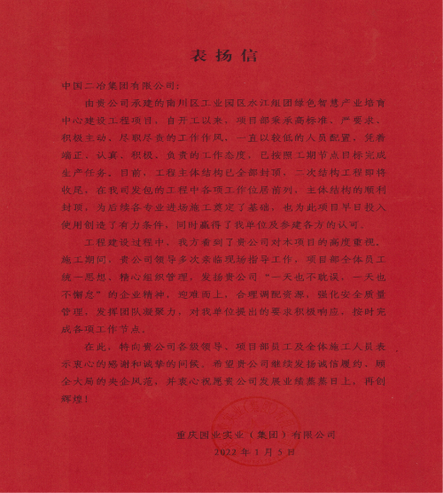 重慶園業(yè)實(shí)業(yè)(集團(tuán))有限公司在表揚(yáng)信中指出,中國二冶南川區(qū)工業(yè)園區(qū)水江組團(tuán)綠色智慧產(chǎn)業(yè)培育中心建設(shè)工程項(xiàng)目自開工以來,項(xiàng)目經(jīng)理部秉承高標(biāo)準(zhǔn)、嚴(yán)要求、積極主動(dòng)、盡職盡責(zé)的工作作風(fēng),如期完成建設(shè)方下達(dá)的工程進(jìn)度目標(biāo),在其公司發(fā)包的眾多工程中各項(xiàng)工作位居前列。希望項(xiàng)目部能夠在接下來的施工建設(shè)工作中繼續(xù)協(xié)調(diào)各方、持續(xù)發(fā)力,推進(jìn)項(xiàng)目早日建成并投入使用,同時(shí)祝愿中國二冶集團(tuán)有限公司發(fā)展業(yè)績蒸蒸日上,再創(chuàng)輝煌。