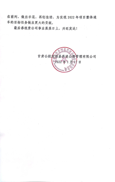 1月17日,甘肅公航旅酒嘉高速公路管理有限公司致中國二冶酒嘉高速公路項目部表揚信,對酒嘉項目在2021年疫情防控、施工管理、黨建共建、國企擔當?shù)确矫姹憩F(xiàn)出來的頑強拼搏、無私奉獻的優(yōu)良作風表示高度贊揚。