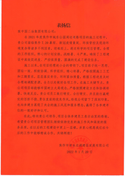 1月21日,焦作市南水北調(diào)建設(shè)發(fā)展有限公司致中國二冶集團(tuán)焦作市城東公園周邊道路建設(shè)工程項目經(jīng)理部表揚(yáng)信,對焦作市城東公園周邊道路建設(shè)工程項目在2021年防汛工作、疫情防控、施工管理、環(huán)保管控等方面表現(xiàn)出來的頑強(qiáng)拼搏、無私奉獻(xiàn)的優(yōu)良作風(fēng)表示高度贊揚(yáng)。