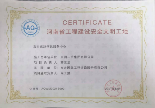 此次榮獲河南省“工程建設安全文明工地”,是對項目全體人員工作的肯定,對于進一步提高項目部安全生產(chǎn)文明施工管理水平具有重要意義。