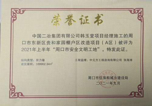 1月23日,中國二冶周口貴和家園項目部收到由周口市住房和城鄉(xiāng)建設(shè)局頒布的“周口市安全文明工地”榮譽(yù)證書。