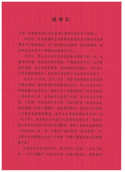 信中指出,非常感謝景禮項目部幫助東臺村硬化村黨群服務(wù)中心院落地面,對于貴單位的無私援助,城關(guān)鎮(zhèn)黨委,政府和東臺村黨員干部群眾必將銘記于心。2021年10月份,蘭州、天水、宕昌等地相繼發(fā)生新冠肺炎確診病例,疫情防控形勢突然緊張之際,景禮項目部積極履行社會責任,組織項目員工慰問了堅守在防控一線的防疫人員,足跡遍布禮縣各個村鎮(zhèn),并為其送去方便面、八寶粥、礦泉水及醫(yī)用口罩,同時組織員工奔赴禮縣駐地高速路口開展志愿服務(wù),協(xié)助維護秩序,連續(xù)多日為防疫人員提供免費就餐服務(wù),成為禮縣疫情防控隊伍中的一支“生力軍",用實際行動支援了禮縣疫情防控工作。景禮項目部的愛心善舉和實際行動猶如涓涓暖流,溫暖了奮戰(zhàn)在疫情防控一線的防疫人員,進一步激發(fā)了他們構(gòu)筑“防疫屏障”、守衛(wèi)群眾生命健康安全的工作熱情,共同匯聚起戰(zhàn)疫必勝的碗礴力量。