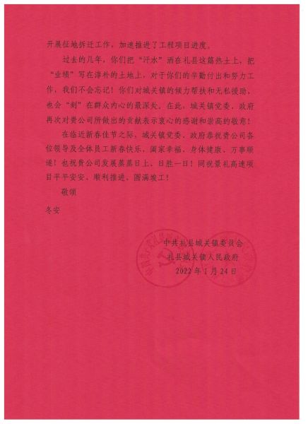 1月24日,中共禮縣城關(guān)鎮(zhèn)委員會、禮縣城關(guān)鎮(zhèn)人民政府致中國二冶景禮項目經(jīng)理部感謝信,對景禮項目部扎根一線,克服艱苦環(huán)境,用精益求精的理念、嚴謹細致的作風、扎實精湛的技能、有力有效的管理,穩(wěn)步推進項目建設(shè),為禮縣今后的發(fā)展修路搭橋、用實際行動詮釋央企的責任和擔當表示高度贊揚。