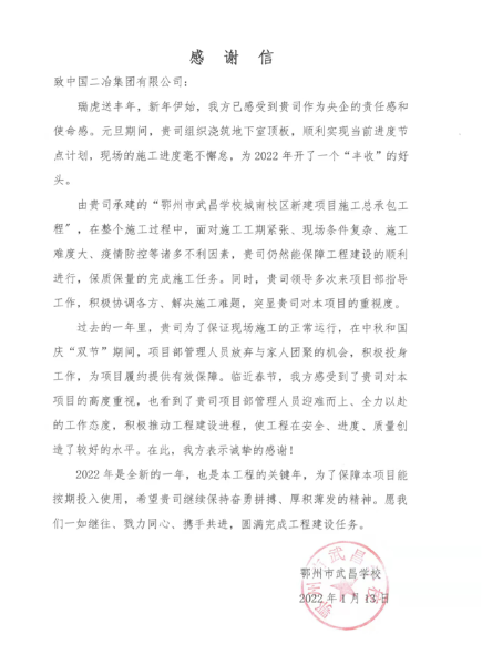 1月20日,中國(guó)二冶連續(xù)收到來(lái)自湖北監(jiān)利市人民醫(yī)院和鄂州市武昌學(xué)校發(fā)來(lái)的表?yè)P(yáng)信,對(duì)中國(guó)二冶各級(jí)領(lǐng)導(dǎo)給予工程高度重視和大力支持表示衷心感謝。
