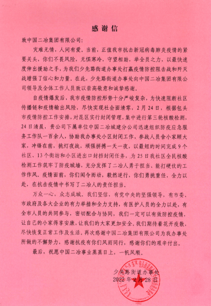 2月28日,包頭市昆區(qū)少先路街道辦事處致中國(guó)二冶感謝信,表揚(yáng)中國(guó)二冶在抗擊新冠病毒肺炎疫情的緊要關(guān)頭,不畏艱險(xiǎn),無懼寒冷,齊心協(xié)力,共抗疫情,展現(xiàn)了中國(guó)二冶愛民為民、守土盡責(zé)、扛鼎重?fù)?dān)、召之必來,來之必戰(zhàn)的擔(dān)當(dāng)與奉獻(xiàn),特向中國(guó)二冶干部職工致以崇高敬意和衷心感謝!
