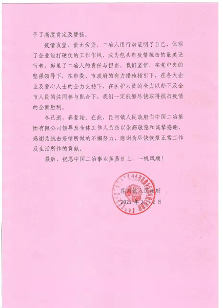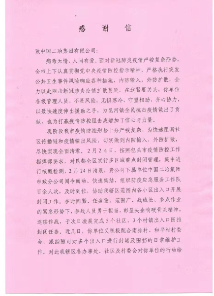 3月2日,昆河鎮(zhèn)人民政府向中國二冶發(fā)來感謝信,對中國二冶在全市全力阻擊新冠肺炎疫情擴(kuò)散蔓延的緊要關(guān)頭,不畏風(fēng)險,無懼寒冷,守望相助,齊心協(xié)力,以最快速度為昆河鎮(zhèn)快速阻斷社區(qū)傳播鏈和疫情輸出風(fēng)險所做出的貢獻(xiàn),對央企快速反應(yīng)、雷厲風(fēng)行的工作作風(fēng)表示感謝。