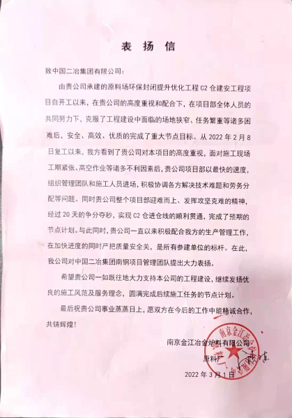 3月1日,南京金江冶金爐料有限公司向中國二冶致表揚(yáng)信,對中國二冶南鋼項目部全體員工在項目施工過程中做出的成績和頑強(qiáng)拼搏的精神表示高度贊揚(yáng)。