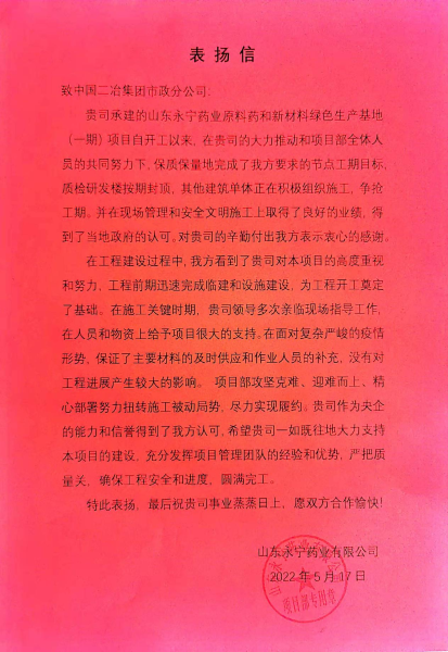 5月17日,中國二冶收到山東永寧藥業(yè)有限公司發(fā)來的感謝信,信中贊揚中國二冶在山東永寧藥業(yè)項目建設(shè)過程中,實干擔當、迎難而上、精心部署,努力克服工期緊、任務重等不利因素,在復雜嚴峻的疫情形勢下,保證材料供應和人員補充,嚴把質(zhì)量關(guān),打造精品工程,充分展現(xiàn)出央企的責任與擔當。