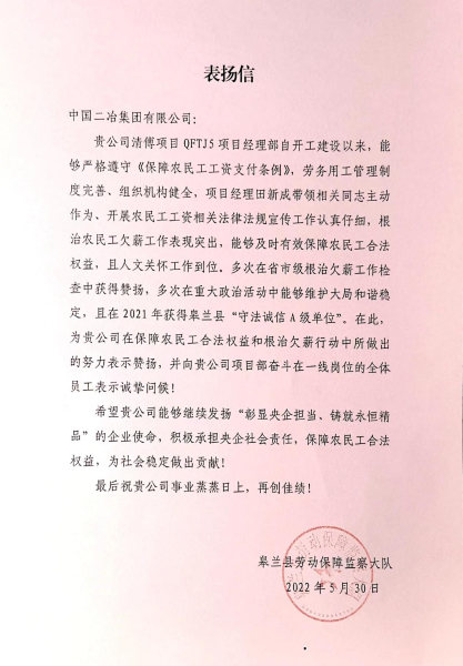 5月31日,中國二冶收到蘭州市皋蘭縣勞動(dòng)保障監(jiān)察大隊(duì)表揚(yáng)信,對(duì)中國二冶清傅項(xiàng)目部勞務(wù)用工實(shí)名制管理工作給予高度贊揚(yáng)和肯定。