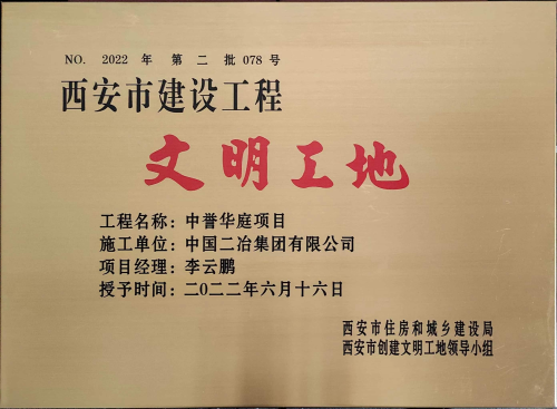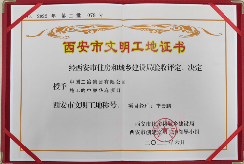 7月5日,中國(guó)二冶收到西安市住房和城鄉(xiāng)建設(shè)局頒發(fā)的榮譽(yù)證書及獎(jiǎng)牌,由中國(guó)二冶承建的中譽(yù)華庭項(xiàng)目榮獲西安市“文明工地”榮譽(yù)稱號(hào)。