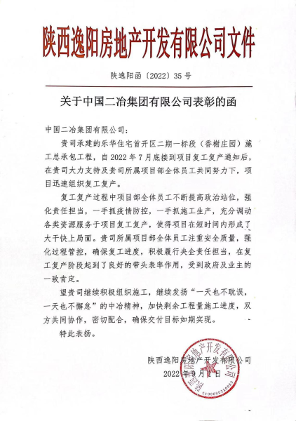 9月1日,中國(guó)二冶收到陜西逸陽(yáng)房地產(chǎn)開發(fā)有限公司發(fā)來的《關(guān)于中國(guó)二冶集團(tuán)有限公司表彰的函》。表彰函充分肯定了中國(guó)二冶陜西分公司在樂華住宅首開區(qū)二期一標(biāo)段(香榭莊園)施工總承包項(xiàng)目復(fù)工復(fù)產(chǎn)以來展現(xiàn)出來的關(guān)鍵時(shí)刻頂?shù)米?,困難面前勇攀登的央企風(fēng)范。