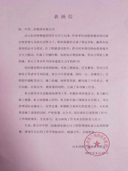 9月29日,山東濟鐵蘭城物流有限公司向中國二冶致表揚信,表揚中國二冶團結(jié)一心、迎難而上,在施工關(guān)鍵節(jié)點,加班加點搶工期,克服重重困難,保質(zhì)保量完成既定目標,充分展示出央企作為國家建設主力軍的擔當作為。