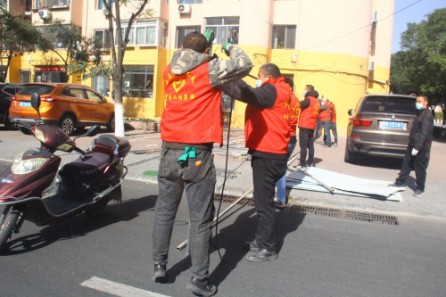 10月8日適逢二十四節(jié)氣中的“寒露”,包頭地區(qū)氣溫驟降十幾度,分公司機關(guān)、項目部黨員迎著刺骨的寒風(fēng),冒著風(fēng)險,發(fā)揮“我不沖誰沖”的帶頭示范作用,迅速組織協(xié)調(diào),搬運防疫封閉用的方鋼、彩鋼板等物資,有的黨員親自動手與職工們團結(jié)配合搭設(shè)架子,安裝彩鋼板,加快小區(qū)封堵進度。在黨員們的帶動下,職工們斗志昂揚,干勁十足,現(xiàn)場呈現(xiàn)一派繁忙景象。上午9:00時,友誼小區(qū)北門封閉完成,下午13:00時少先二十三社區(qū)封堵完畢,緊接著少先二十二社區(qū)、友誼十八、友誼十三……等社區(qū)紛紛傳來好消息,當(dāng)天晚上20:25,隨著最后一個社區(qū)門全面封堵,標(biāo)志著中國二冶快速完成9個社區(qū)、13個街坊和小區(qū)、451棟住宅樓的進出口封閉封堵任務(wù),一道道宛如長龍的藍色城墻屹立在少先路街道街區(qū)四周,二冶人打贏了一場又一場漂亮的攻堅戰(zhàn)。