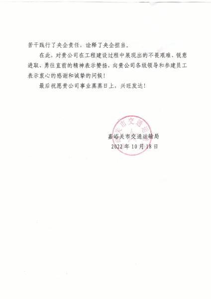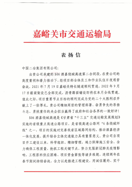 10月18日,中國二冶酒嘉項目收到甘肅省嘉峪關(guān)市交通運輸局表揚信,對酒嘉項目克服疫情困難,科學(xué)組織、精細管理,全力推進工程建設(shè)等工作提出贊揚和感謝。