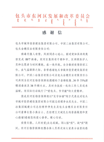 感謝信中寫道,面對突如其來的新冠肺炎疫情,全市廣大共產(chǎn)黨員、醫(yī)護(hù)人員、公安干警、下沉干部、社區(qū)工作者、防疫志愿者等,以“一家不圓萬家圓”的奉獻(xiàn)精神,以“不教胡馬度陰山”的英雄氣概,不懼風(fēng)險(xiǎn),不舍晝夜,不辭辛勞,持續(xù)奮戰(zhàn)在醫(yī)療服務(wù)、隔離管控、交通卡點(diǎn)、流調(diào)排查、核酸檢測、物資配送、消殺保潔等戰(zhàn)線上,為全市打贏疫情防控攻堅(jiān)戰(zhàn)作出突出貢獻(xiàn)。中國二冶主動踐行抗疫精神,勇于擔(dān)當(dāng),星夜兼程完成3個(gè)疫情防控隔離點(diǎn)改造建設(shè)任務(wù),疫不容辭、奮力搶拼包頭市防疫隔離點(diǎn)項(xiàng)目建設(shè)任務(wù),及時(shí)向東河區(qū)政府捐贈防疫物資,為抗疫一線工作人員送去溫暖,為包頭市東河區(qū)疫情防控工作提供有力保障,彰顯了中國二冶“愛包頭、做貢獻(xiàn)”大愛無疆的奉獻(xiàn)精神,充分體現(xiàn)了新時(shí)代駐包央企的新?lián)?dāng)新作為。疫情面前,聞令而動,毅然逆行,勇挑重任,全力以赴,讓黨旗在包頭市疫情防控一線高高飄揚(yáng)。再次感謝中國二冶的愛心善舉,暖心行動。感謝中國二冶干部職工,用一腔忠誠和熱血,用骨子里的澎湃激情凝聚成打贏這場疫情阻擊戰(zhàn)的強(qiáng)大合力!病毒無情人有情,風(fēng)雨同舟向前進(jìn),危難之際顯身手。