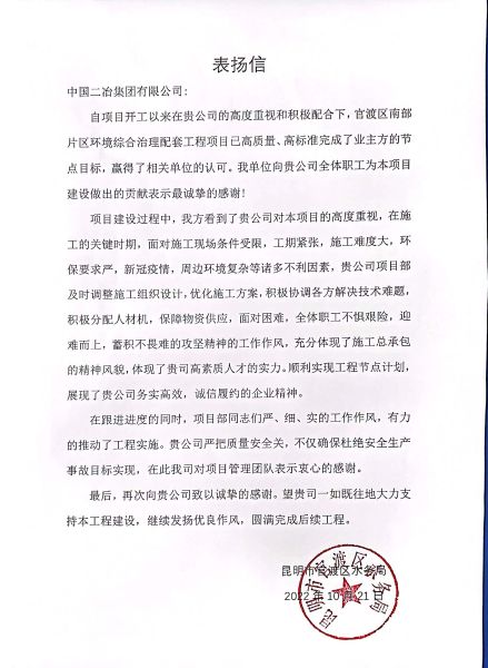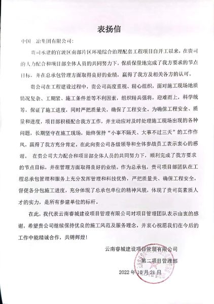 10月22日,中國二冶官渡項目部連續(xù)收到兩封來自業(yè)主單位昆明市官渡區(qū)水務(wù)局和云南睿城建設(shè)項目有限公司的表揚信,對中國二冶路橋分公司官渡項目部在官渡區(qū)南部片區(qū)環(huán)境綜合治理配套工程項目建設(shè)過程中,直面多種困難,精心策劃、科學(xué)管理、全力以赴的工作態(tài)度表示贊賞。