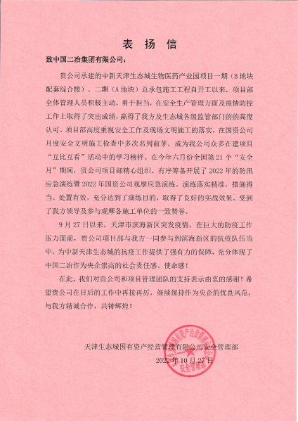 10月27日,天津生態(tài)城國有資產(chǎn)經(jīng)營管理有限公司安全管理部向中國二冶致表揚(yáng)信,對中國二冶集團(tuán)中新天津生態(tài)城生物醫(yī)藥產(chǎn)業(yè)園項(xiàng)目部自開工以來積極主動(dòng)、勇于擔(dān)當(dāng)、提前謀劃、精心組織給予表揚(yáng),同時(shí)對項(xiàng)目部在安全生產(chǎn)管理方面及疫情防控工作上所取得的突出成績表示了高度贊賞。
