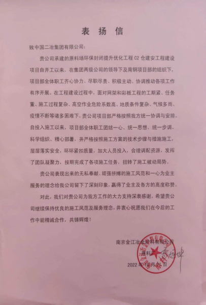 10月21日,中國二冶南鋼項目部收到來自業(yè)主單位南京金江冶金爐料有限公司原料廠的表揚信,對中國二冶冶金分公司南鋼項目部在承建的原料廠環(huán)保封閉提升優(yōu)化工程C2倉建安工程項目建設(shè)過程中講信譽、重合同、保履約給予表揚,同時對項目部的嚴格管理以及優(yōu)秀的工作態(tài)度表示贊賞。
