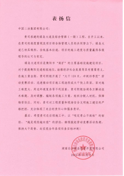 11月2日,湖南白沙綠島投資開發(fā)有限公司向中國二冶致表揚(yáng)信,對中國二冶湖南分公司承建的綠島大道及綜合管廊(一期)項(xiàng)目自開工以來能夠不畏艱難,保質(zhì)保量地完成綠島大道全線貫通任務(wù)提出表揚(yáng)。