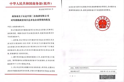 近日,中國二冶收到中華人民共和國商務(wù)部(批件),中國二冶對(duì)外援助成套項(xiàng)目總承包企業(yè)資格成功通過延續(xù)批復(fù)。