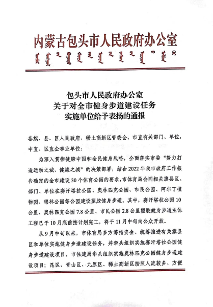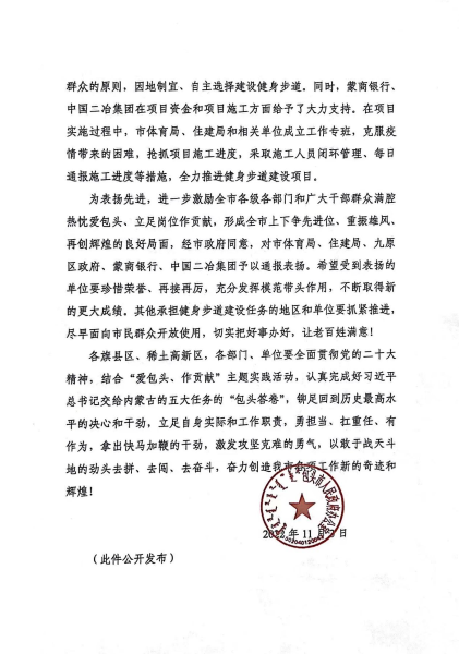 11月9日,中國二冶收到包頭市政府表揚信,對中國二冶在包頭市健身步道建設任務中所作的突出貢獻表示高度贊揚。