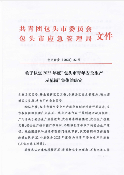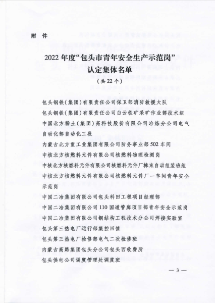 11月10日,中國二冶收到共青團包頭市委員會、包頭市應急管理局認定決定,認定中國二冶城建分公司包頭科田項目部、冶金分公司110國道管廊項目部、鋼構分公司焊接實驗室三個集體為2022年度“包頭市青年安全示范崗”集體榮譽稱號。