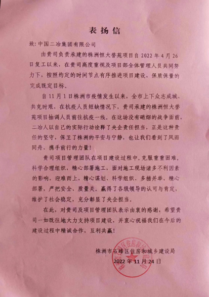表?yè)P(yáng)信中指出,自11月1日株洲市疫情發(fā)生以來,全市上下眾志成城、共克時(shí)艱,在抗疫人員短缺情況下,中國(guó)二冶株洲恒大項(xiàng)目部抽調(diào)職工前往抗疫一線,為當(dāng)?shù)匾咔榉揽毓ぷ魈峁┯辛ΡU?。在這場(chǎng)沒有硝煙的戰(zhàn)爭(zhēng)面前,二冶人以自己的實(shí)際行動(dòng)詮釋了央企責(zé)任擔(dān)當(dāng),正是這種責(zé)任的堅(jiān)守,保衛(wèi)了株洲的平安與寧?kù)o,也讓當(dāng)?shù)卣吹搅硕憋L(fēng)雨同舟、攜手前行的力量!并且在恒大項(xiàng)目復(fù)工建設(shè)過程中,面對(duì)施工現(xiàn)場(chǎng)諸多不利因素的影響,中國(guó)二冶項(xiàng)目部管理人員迎難而上,克服重重困難,精心部署,贏得了各級(jí)領(lǐng)導(dǎo)的認(rèn)可與肯定,維護(hù)了社會(huì)穩(wěn)定,充分彰顯了央企擔(dān)當(dāng)。