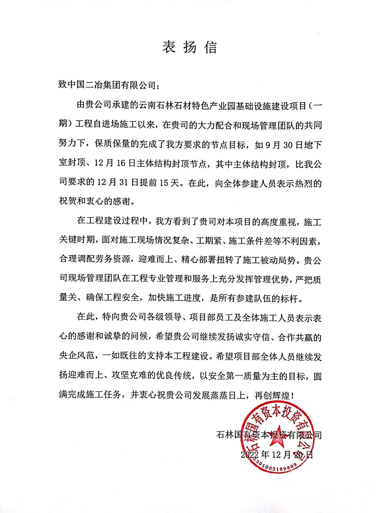 12月22日,中國(guó)二冶路橋分公司云南石林石材產(chǎn)業(yè)園項(xiàng)目又一次收到來(lái)自石林國(guó)有資本投資有限公司的表?yè)P(yáng)信,這是自十月以來(lái)項(xiàng)目收到的第二封建設(shè)單位表?yè)P(yáng)信,兩封表?yè)P(yáng)信不僅是對(duì)項(xiàng)目管理團(tuán)隊(duì)鼓勵(lì)和肯定,也是對(duì)中國(guó)二冶做為國(guó)家建設(shè)主力軍的高度認(rèn)可。