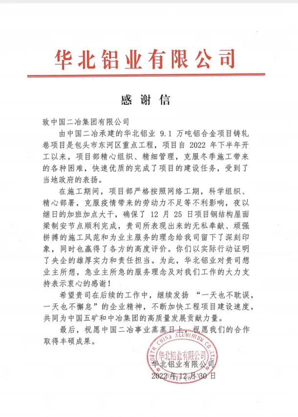 華北鋁業(yè)有限公司在信中指出,中國二冶在施工期間,嚴(yán)格按照網(wǎng)絡(luò)工期,科學(xué)組織、精心部署,克服疫情帶來的勞動力不足等不利影響,夜以繼日加班加點(diǎn)大干,確保了12月25日項(xiàng)目鋼結(jié)構(gòu)屋面梁制安的順利結(jié)束,貴司所表現(xiàn)出來的無私奉獻(xiàn)、頑強(qiáng)拼搏的施工風(fēng)范和為業(yè)主服務(wù)的理念給我司留下了深刻印象,同時也贏得了各方的高度評價。你們以實(shí)際行動證明了央企的雄厚實(shí)力和責(zé)任擔(dān)當(dāng)。