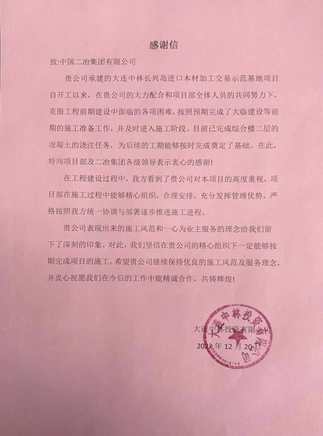 大連中林投資有限公司在信中指出,在工程建設(shè)過程中,我方看到貴司對本項(xiàng)目的高度重視,項(xiàng)目部在施工過程中能夠精心組織,合理安排,充分發(fā)揮管理優(yōu)勢,嚴(yán)格按照我方統(tǒng)一協(xié)調(diào)與部署快速推進(jìn)施工速度,得到各方的贊賞。