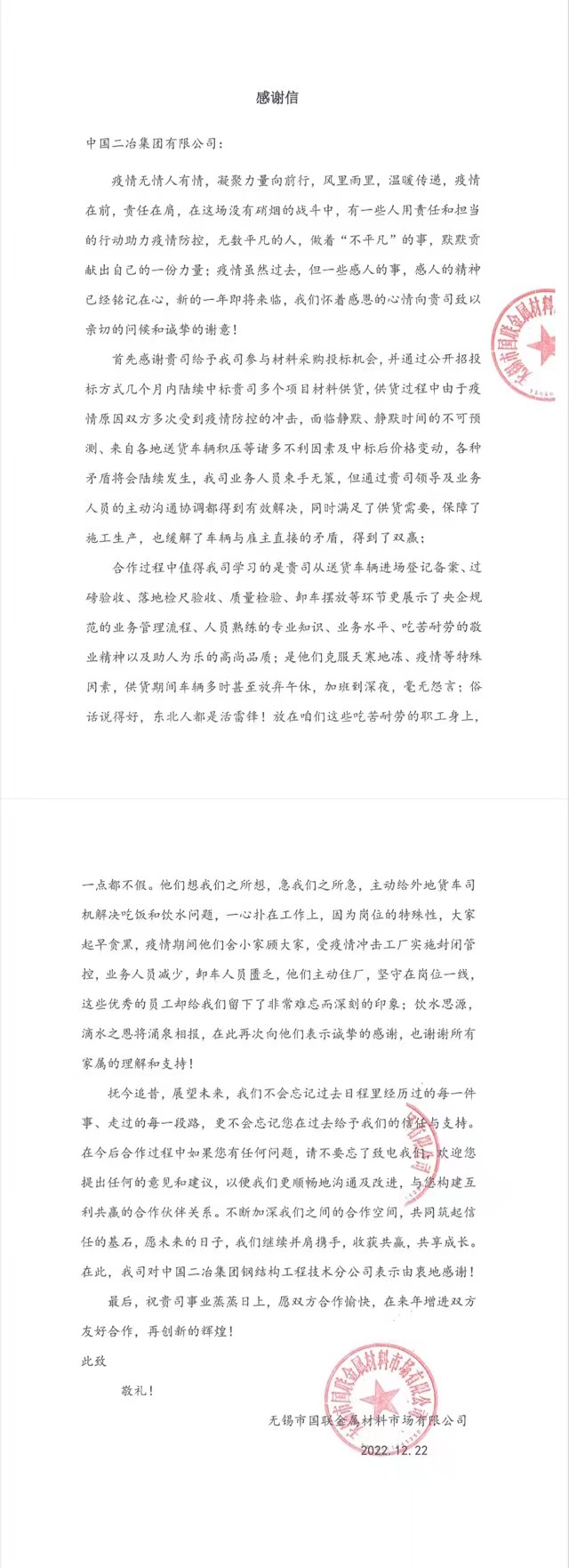 無錫市國聯(lián)金屬材料市場有限公司在感謝信中指出,撫今追昔,展望未來,我們不會忘記過去日子里經(jīng)歷過的每一件事,走過的每一段路,更不會忘記中國二冶在過去給予我們的信任與支持。讓我們構(gòu)建互利共贏的合作伙伴關(guān)系,不斷加深合作,共同筑起信任的基石,繼續(xù)并肩攜手,收獲共贏,共享成長。
