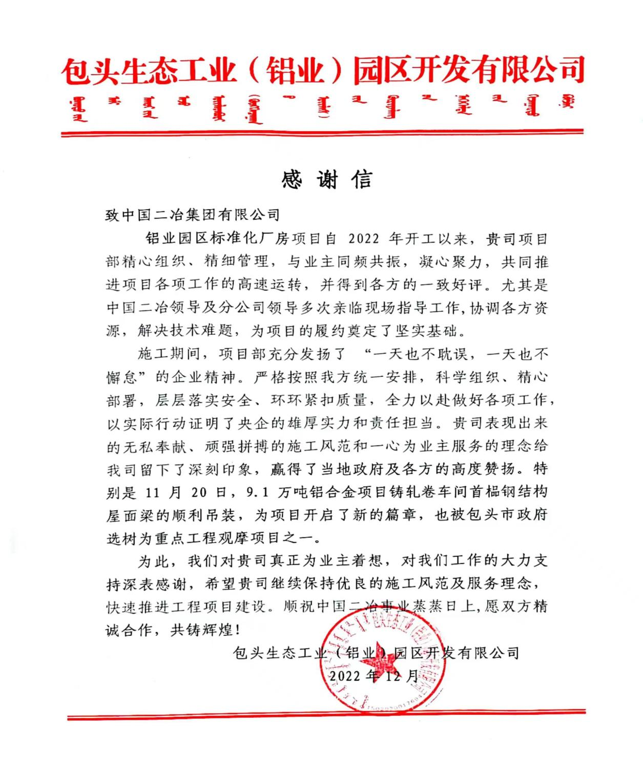 包頭生態(tài)工業(yè)(鋁業(yè))園區(qū)開發(fā)有限公司在感謝信中指出,在施工期間,中國二冶項(xiàng)目部充分發(fā)揚(yáng)了“一天也不耽誤,一天也不懈怠”的企業(yè)精神。嚴(yán)格按照我方統(tǒng)一安排,科學(xué)組織、精心部署,層層落實(shí)安全、環(huán)環(huán)緊扣質(zhì)量,全力以赴做好各項(xiàng)工作,以實(shí)際行動證明了央企的雄厚實(shí)力和責(zé)任擔(dān)當(dāng)。貴司表現(xiàn)出來的無私奉獻(xiàn)、頑強(qiáng)拼搏的施工風(fēng)范和一心為業(yè)主服務(wù)的理念給我司留下了深刻印象,贏得了當(dāng)?shù)卣案鞣降母叨荣潛P(yáng)。