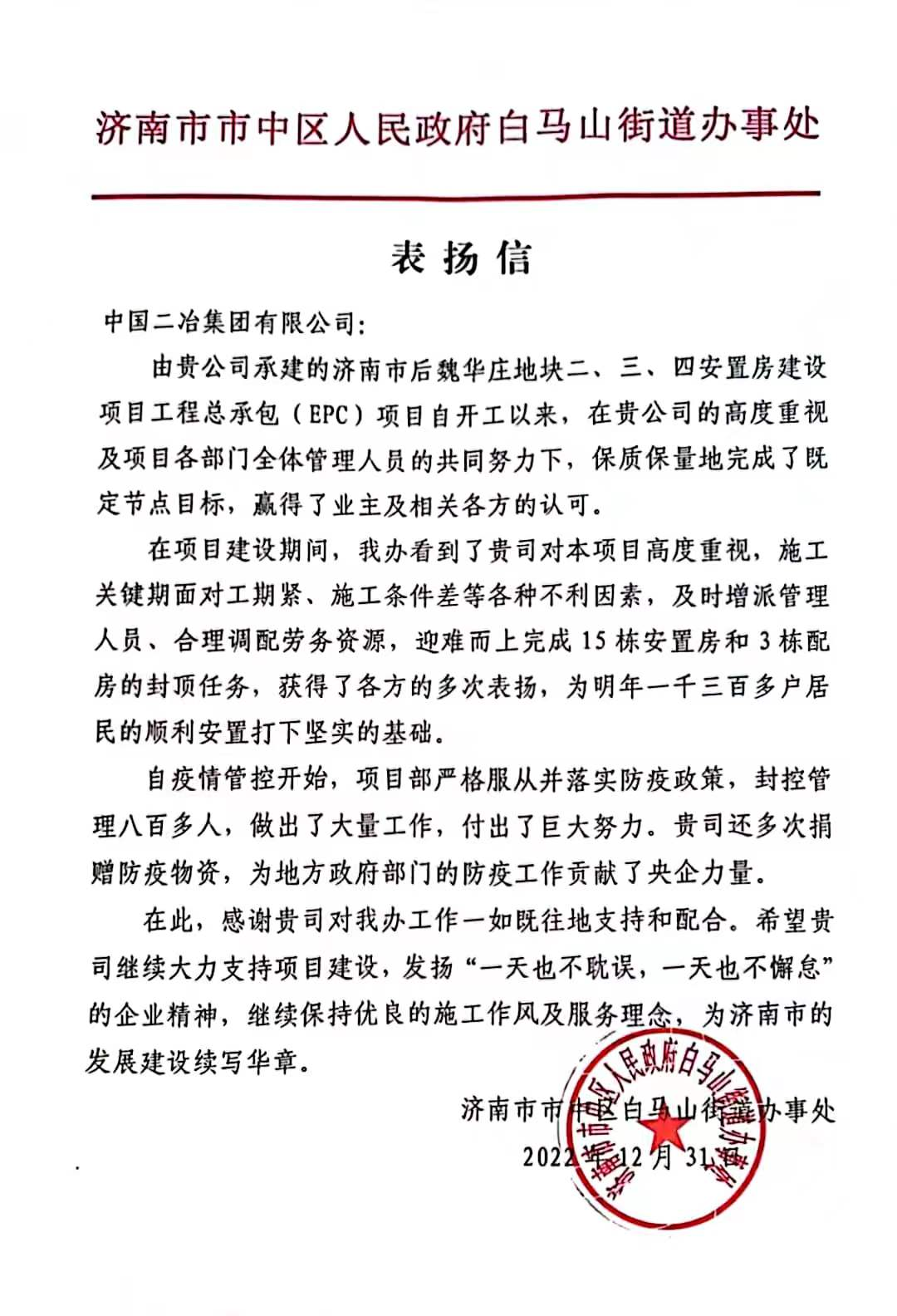 1月2日,濟南市中區(qū)白馬山街道辦事處致中國二冶表揚信,對中國二冶在濟南市后魏華莊地塊二、三、四安置房建設項目中的安全、進度、質量、文明施工、疫情防控等各項工作表示認可,并對項目部管理團隊表示感謝和肯定。