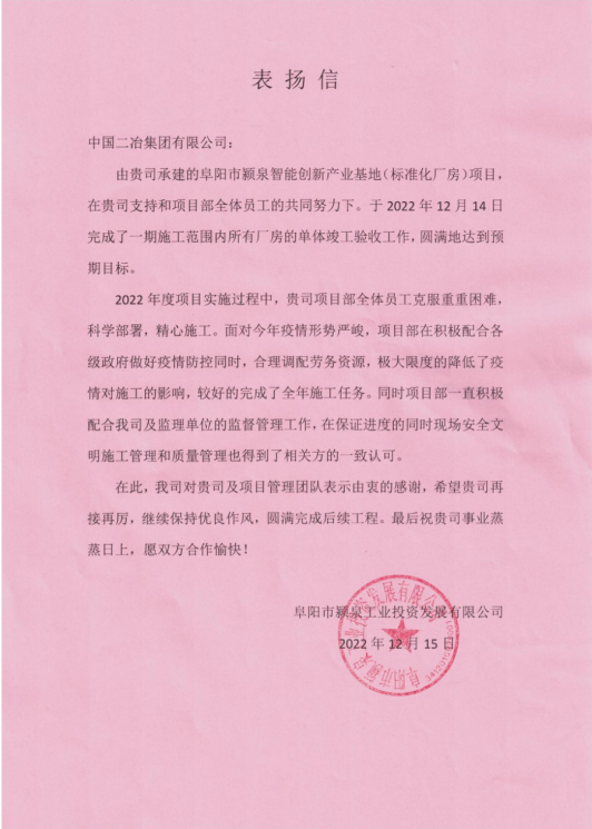 12月18日,中國二冶華東分公司承建的阜陽市潁泉智能創(chuàng)新產(chǎn)業(yè)基地(標準化廠房)項目部收到業(yè)主方阜陽市穎泉工業(yè)投資發(fā)展有限公司的表揚信,對華東分公司阜陽項目部在阜陽市潁泉智能創(chuàng)新產(chǎn)業(yè)基地(標準化廠房)工程建設(shè)過程中,勇于面對各種困難、精心策劃、科學(xué)管理、全力以赴的工作態(tài)度表示贊許。