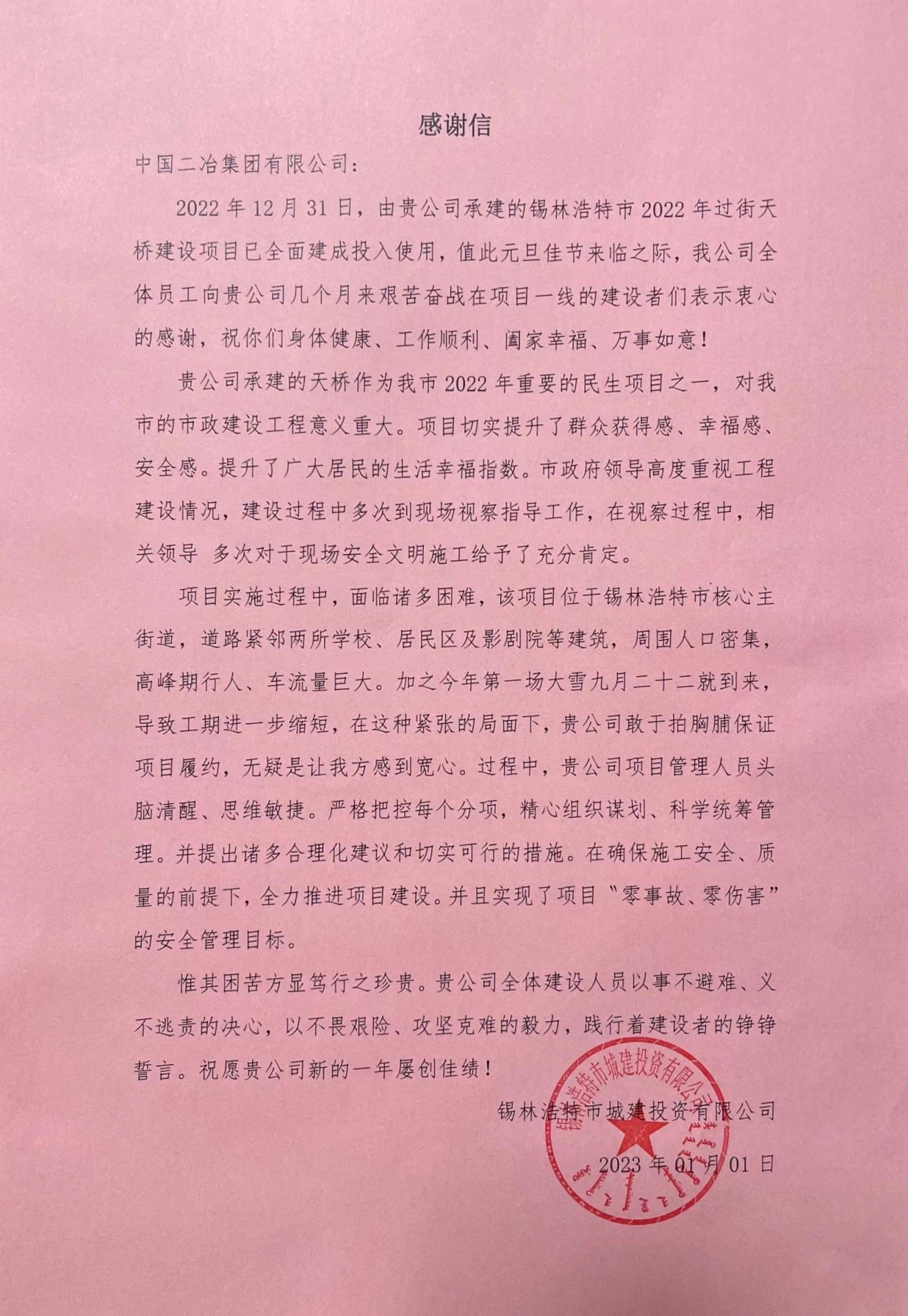 感謝信中寫到,錫林浩特市過街天橋項(xiàng)目是錫林浩特市2022年重要的民生項(xiàng)目之一,對錫林浩特市的市政建設(shè)工程意義重大。中國二冶在項(xiàng)目實(shí)施過程中努力克服疫情嚴(yán)峻、施工環(huán)境限制等諸多困難,面對初雪早至,壓縮工期的緊張局面,項(xiàng)目建設(shè)團(tuán)隊(duì)事不避難、義不逃責(zé),精心組織謀劃,科學(xué)統(tǒng)籌管理,在確保施工安全、質(zhì)量的前提下,全力推進(jìn)項(xiàng)目建設(shè),實(shí)現(xiàn)項(xiàng)目“零事故、零傷害”的安全管理目標(biāo)。錫林浩特市城建投資有限公司對中國二冶項(xiàng)目一線工作者表示衷心感謝并致以節(jié)日問候。