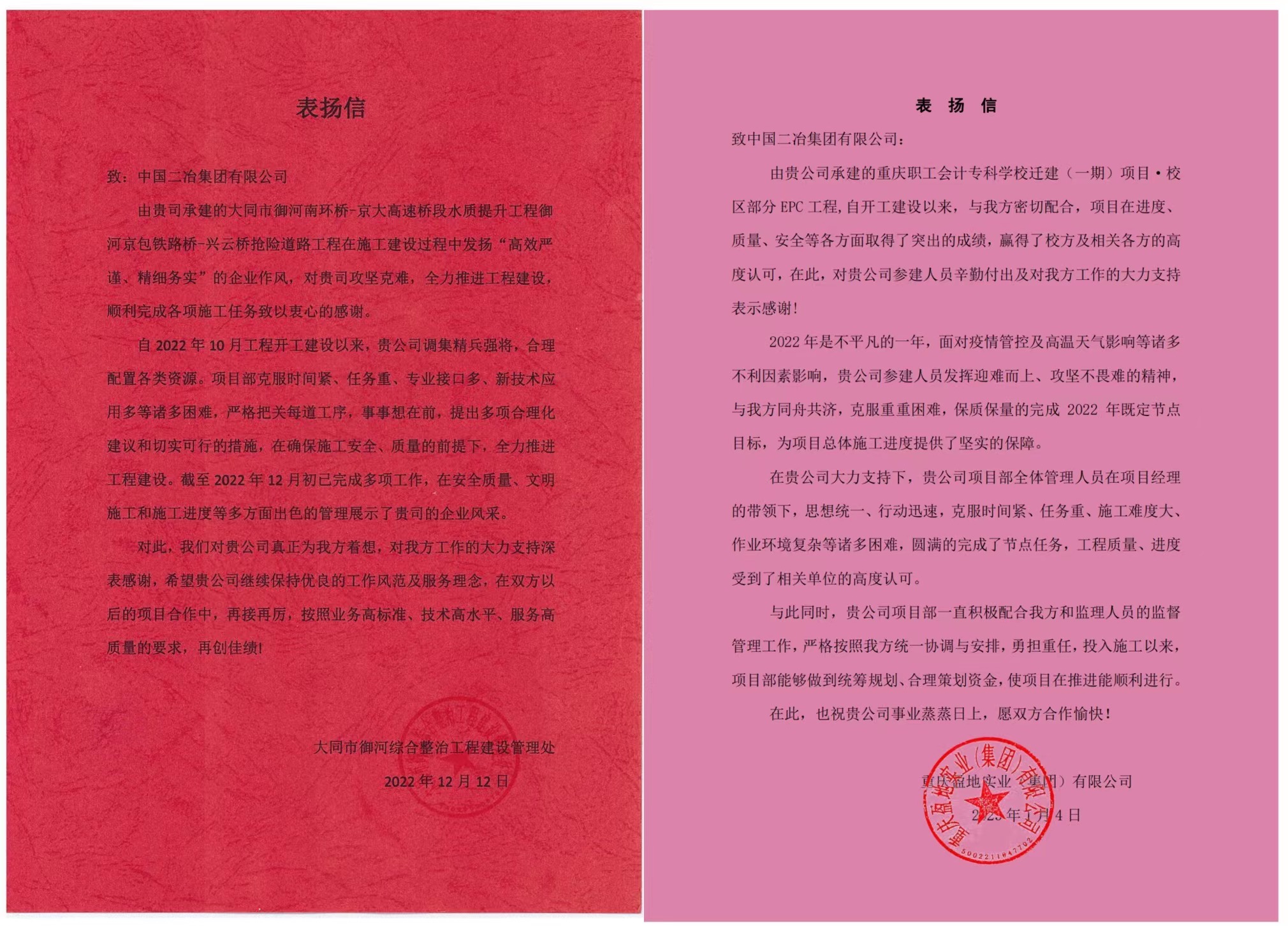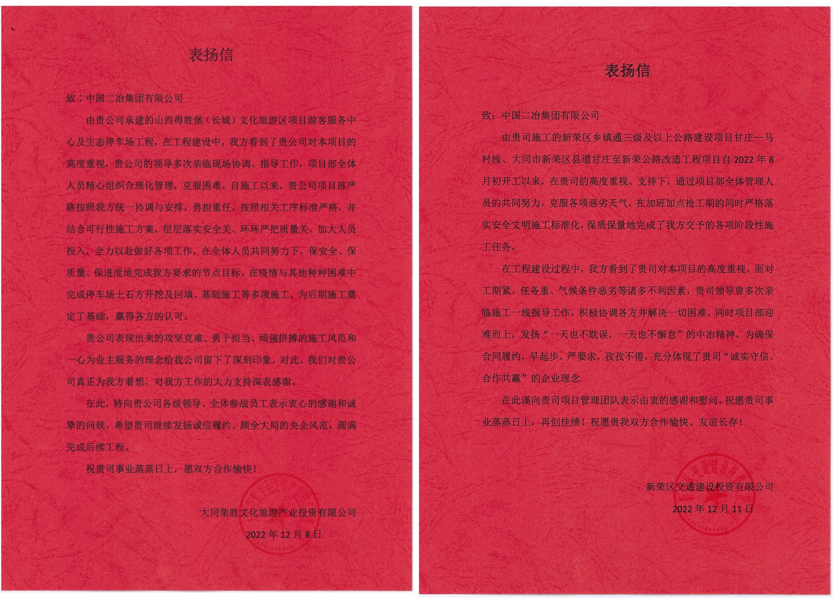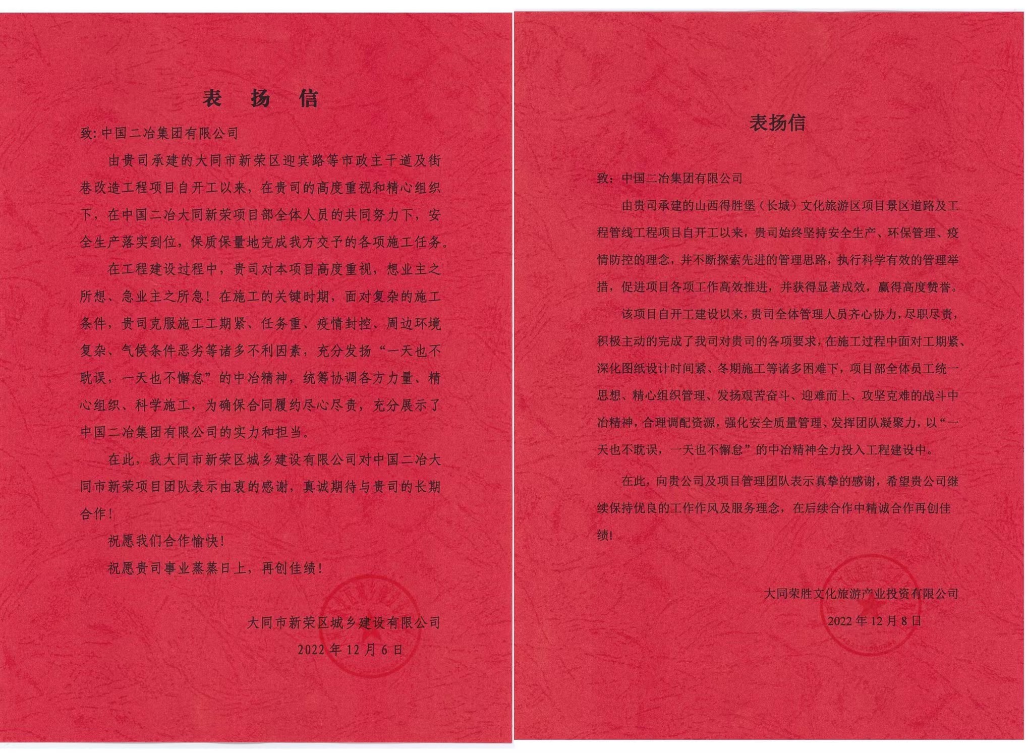 歲末年初,中國二冶各項目部陸續(xù)收到所承建的大同市新榮區(qū)迎賓路等市政工程項目、山西得勝堡游客服務(wù)中心及生態(tài)停車場工程項目、大同市新榮區(qū)新甘馬三級公路項目、山西得勝堡得勝廣場景區(qū)道路及工程管線工程項目、大同市御河搶險道路工程項目、重慶職工會計??茖W(xué)校遷建(一期)項目以及金盛快速路北段——杭蓋路連接線項目共計七個項目業(yè)主單位的表揚信。